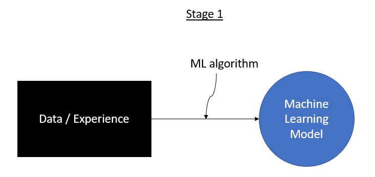 The training stage involves developing a model by applying a machine learning algorithm to a dataset.