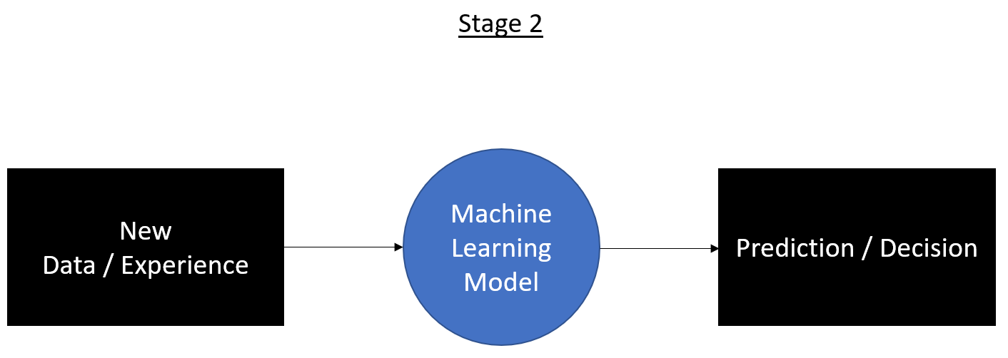 The prediction stage involves taking new data and using our developed machine learning model to make a prediction.